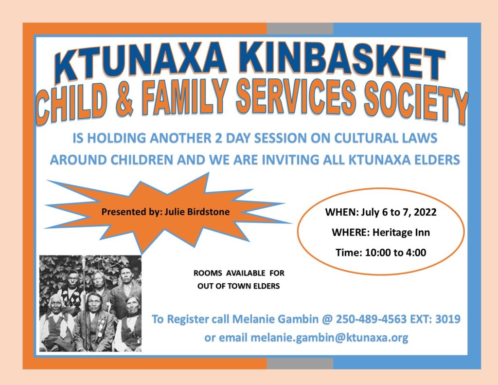 Bill C-92 Elder Info Session #2 on July 6-7, 2022- Presented by Julie Birdstone Contact Melanie Gambin to register: (250) 489-4563 Ext. 3019 or melanie.gambin@ktunaxa.org